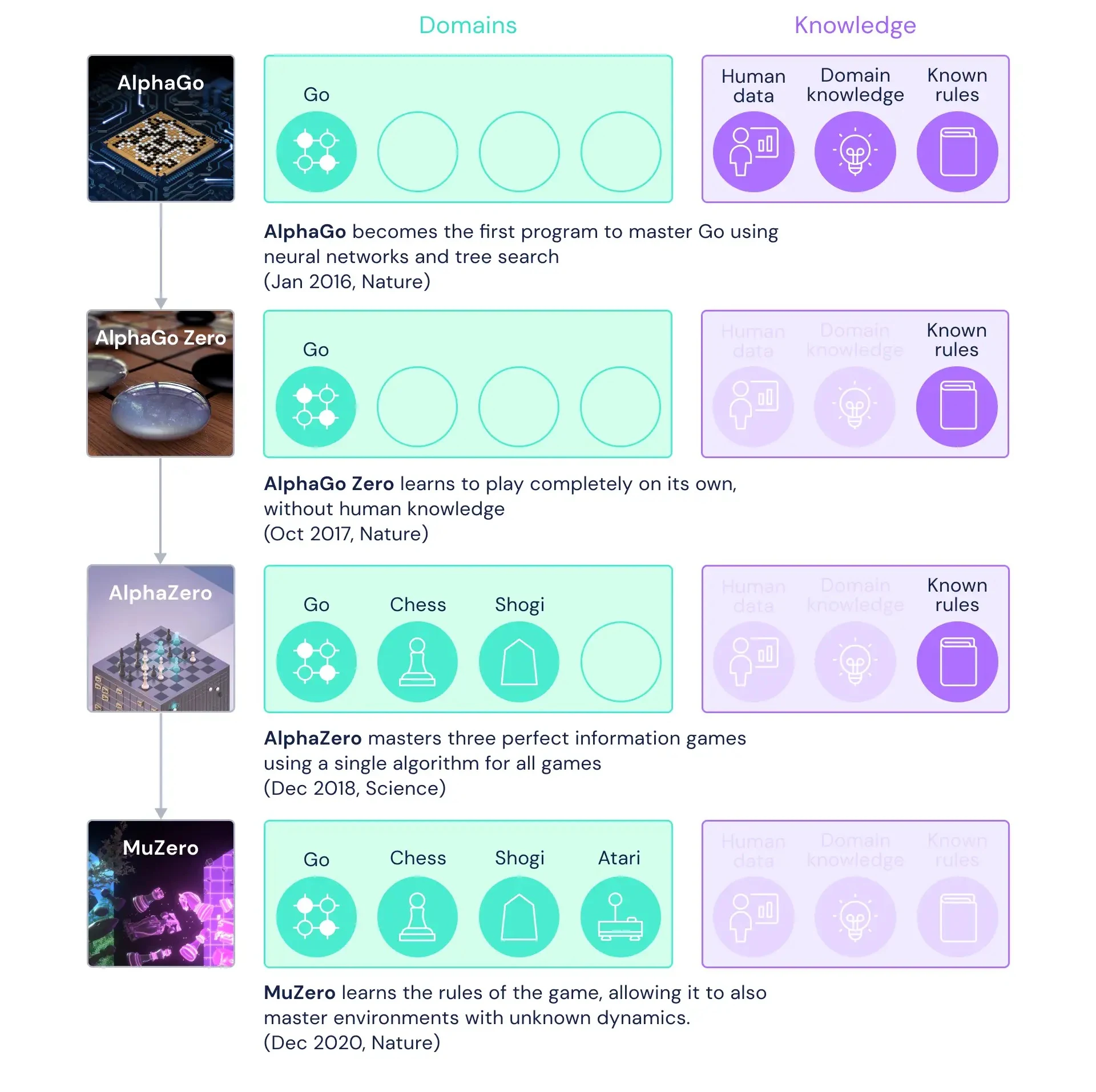 The following article is by DeepMind on the progression from AlphaGo, AlphaZero to MuZero: https://deepmind.google/blog/muzero-mastering-go-chess-shogi-and-atari-without-rules/